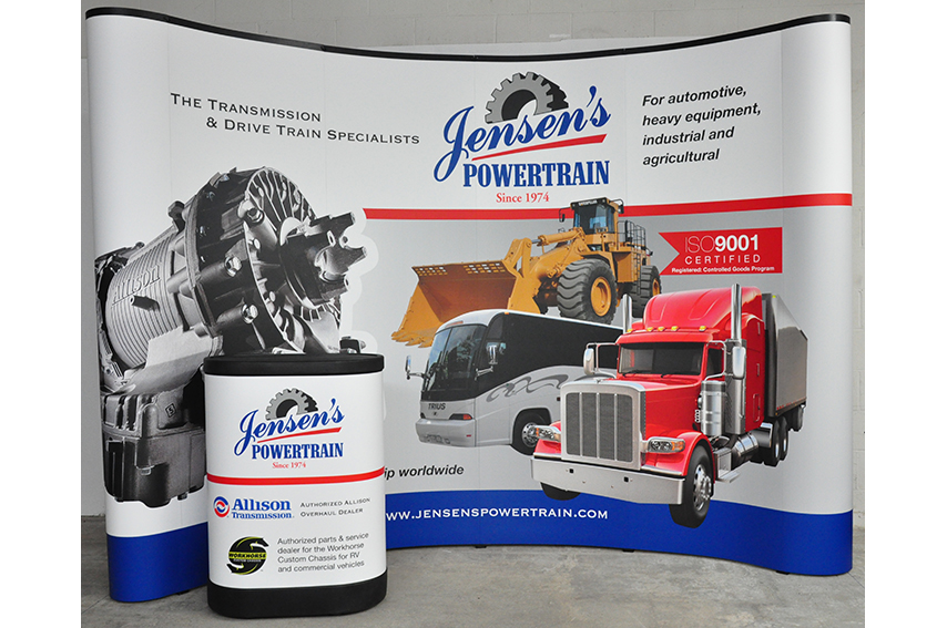 The entire 10 feet portable pop up display kit weighs just under 100 lbs and this light weight Display System has spring loaded action to assist in the setup, is made from tempered aluminum for a safe but sturdy frame and it all fits into a single wheeled carrying case that can also be converted to a podium for counter use at trade shows and events. Counter tops can also be customized to match your specific function or event.